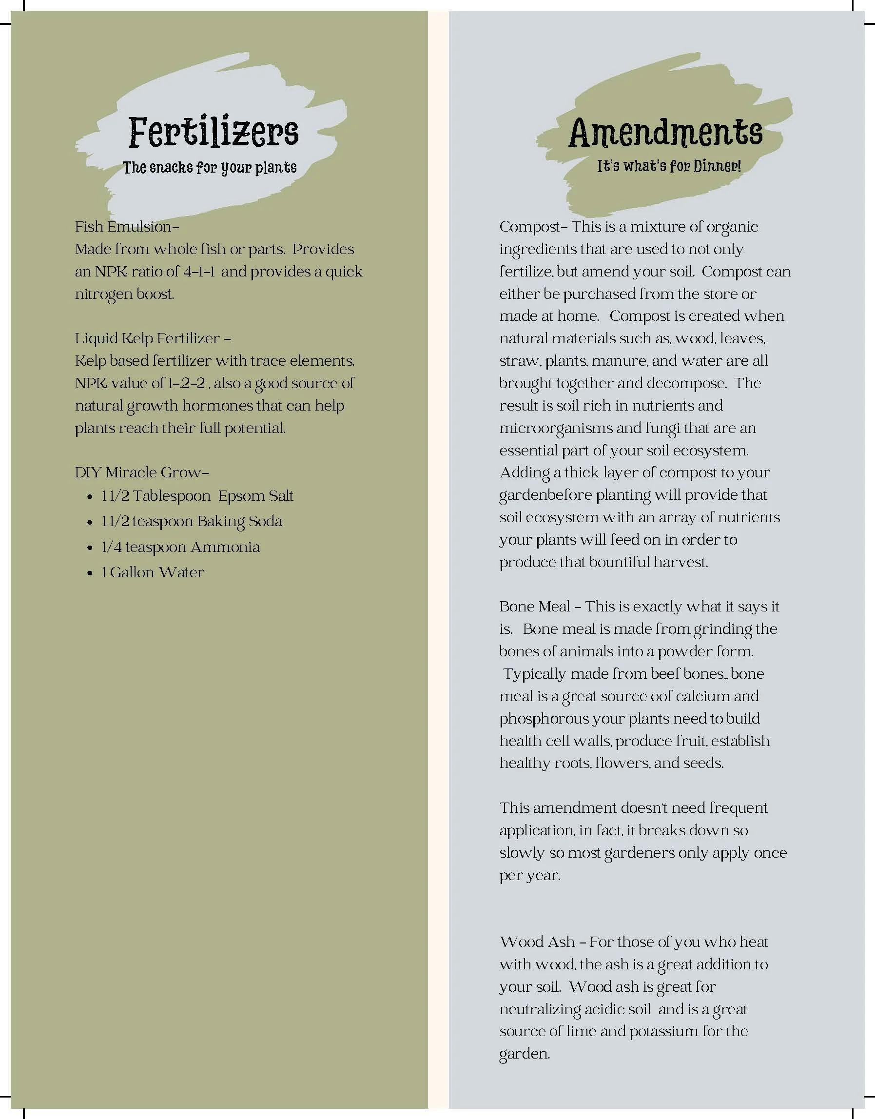 Amendments are simple things like compost, leaves, sticks, worm castings, rotting logs, eggshells etc. Amendments are the ways mother nature feeds her forests, and fields. Amendments are typically added to the soil typically in the spring and fall to assist in maintaining that ecosystem in the soil. You'll see a list of basic amendments and their function in the picture below.